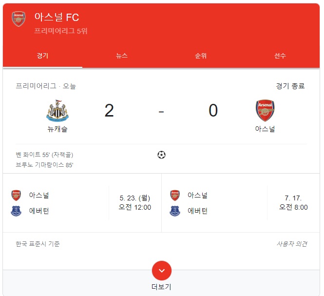 5월17일 아스널 vs 뉴캐슬 축구 경기결과