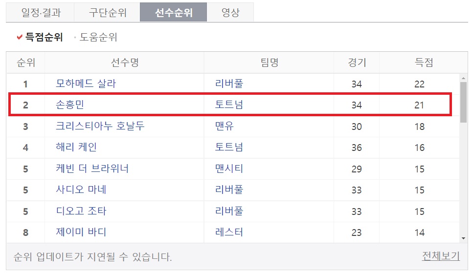 현재 프리미어리그 득점경쟁은 모하메드 살라는 34경기 22골로 1위를 달리고 있으나 마지막 라운드에서 경기출전 자체가 불확실한 상황입니다. 또한 최근 한달동안 득점이 없는 상황입니다. 한편 손흥민은 현재 최상의 컨디션이며 어느때보다 득점선두에 대한 열망이 클것입니다.