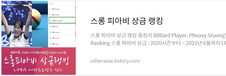 깜보디아 국적 당구선수, 스롱 피아비 였을까요? 아니면 김가영, 김세연, 강지은 선수 가운데 한명일까요? 아래 2022-2022 시즌 LPBA 투어 랭킹 자료에서 확인해 보시기 바랍니다.