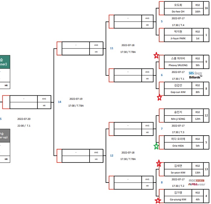 서바이벌 경기의 성적은 득점수가 아닌 3쿠션 당구 에버리지로 결정을 하며, 에버리지가 같으면, 하이런 득점수로 순위를 결정합니다. 또한 그리고 3쿠션(=3구당구) 서바이벌 경기에서 조 2위로 16강 대진표에 이름을 여자 프로 당구선수는 스롱 피아비, 장혜리, 이화연, 송민지, 김세연, 오수정, 임정숙, 오도희 당구선수입니다.