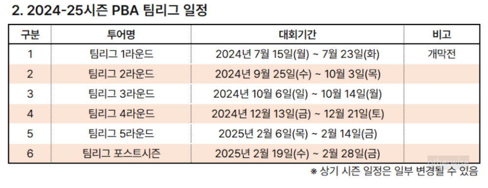 [ 2024-05-29 PBA보도저자료 ] 프로당구 PBA가 내달 16일 시즌을 개막, 9개월간의 대장정에 돌입한다. 프로당구협회(PBA∙총재 김영수)는 28일 오전 “내달 16일 2024-25시즌 PBA-LPBA투어 개막전을 시작으로 내년 3월 월드챔피언십까지 10개 투어를 개최한다”고 발표했다. 지난 시즌과 동일한 10개 투어, 팀리그 역시 정규 5라운드를 거쳐 포스트시즌을 진행하는 방식이다.