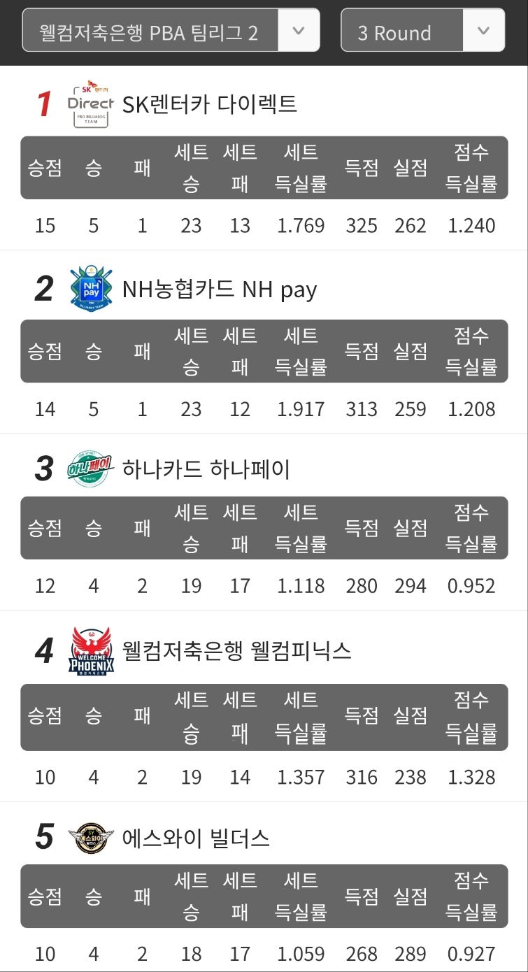 프로당구 2025-26 3라운드 6일차 PBA 팀리그 경기결과 순위 1위는 sk렌터카 당구팀입니다. 하나카드 당구팀은 nk농협카드 당구팀에게 패하여 3위 자리로 내려갔습니다 3라운드 우승팀 후보도 윤곽이 나오고 있습니다.
