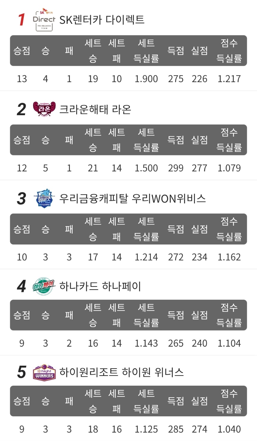 전원 승리와 2점대 에버리지, 빛난 우리금융캐피탈 프로당구팀