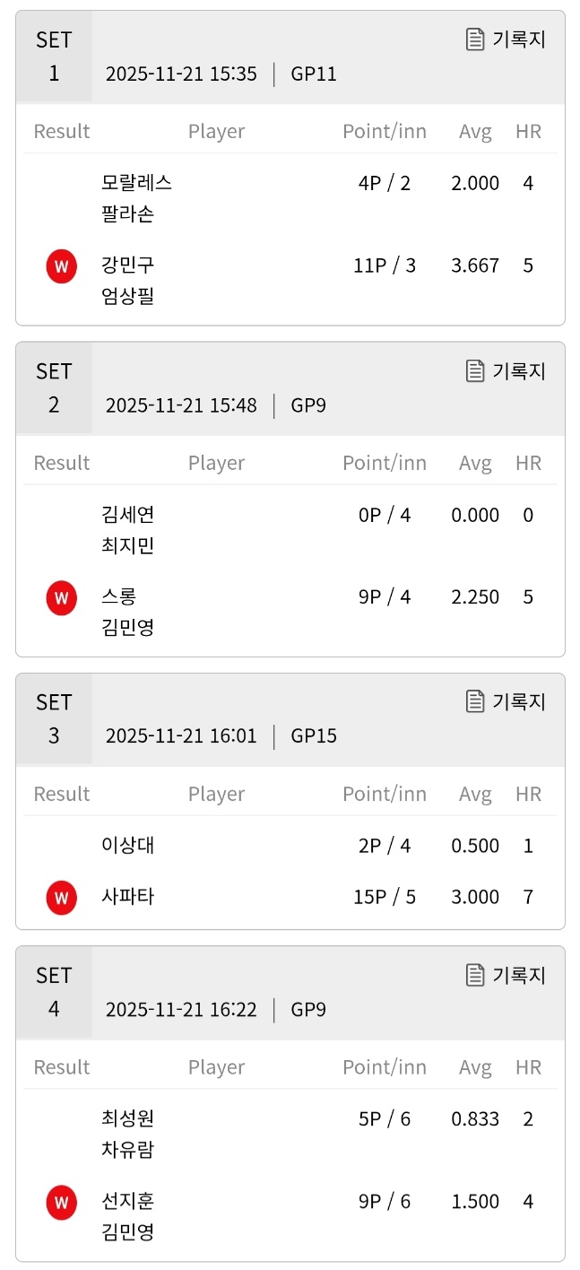 3세트 남자 단식에서는 이사대와 사파타의 맞대결이 펼쳐졌습니다. 초반에는 이사대 선수가 안정적으로 출발했지만, 사파타가 점점 감을 되찾으며 폭발적인 득점을 이어갔습니다. 결국 사파타가 5이닝 동안 15점을 기록하며 15 대 2로 승리, 에버리지 3.000과 하이런 7점을 기록해 에이스다운 면모를 보여주었습니다.