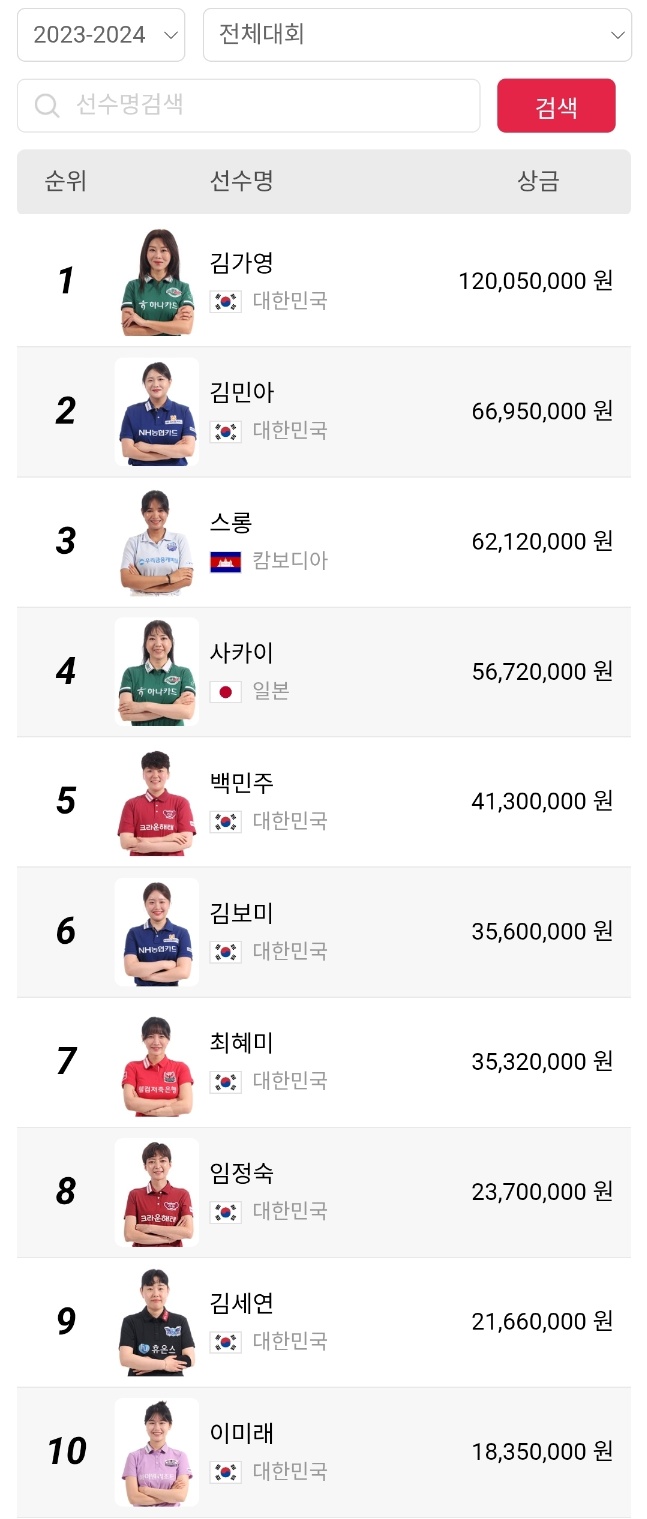 LPBA 상금 랭킹으로 보는 여자 프로당구 선수 순위