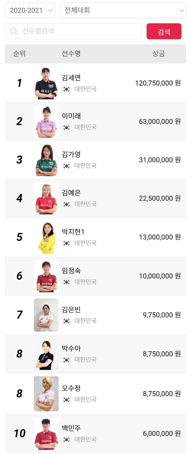 2020-2021 시즌에는 판도가 크게 바뀌었습니다. 김세연 선수가 약 1억 2천만 원이 넘는 상금을 기록하며 시즌 상금 1위에 올랐고, 이미래와 김가영이 뒤를 이었습니다. 김예은, 박지현, 김은빈, 박수아, 오수정, 백민주 등 젊은 한국 선수들이 상위권을 채우며 세대교체의 가능성을 보여 준 시즌이었습니다.