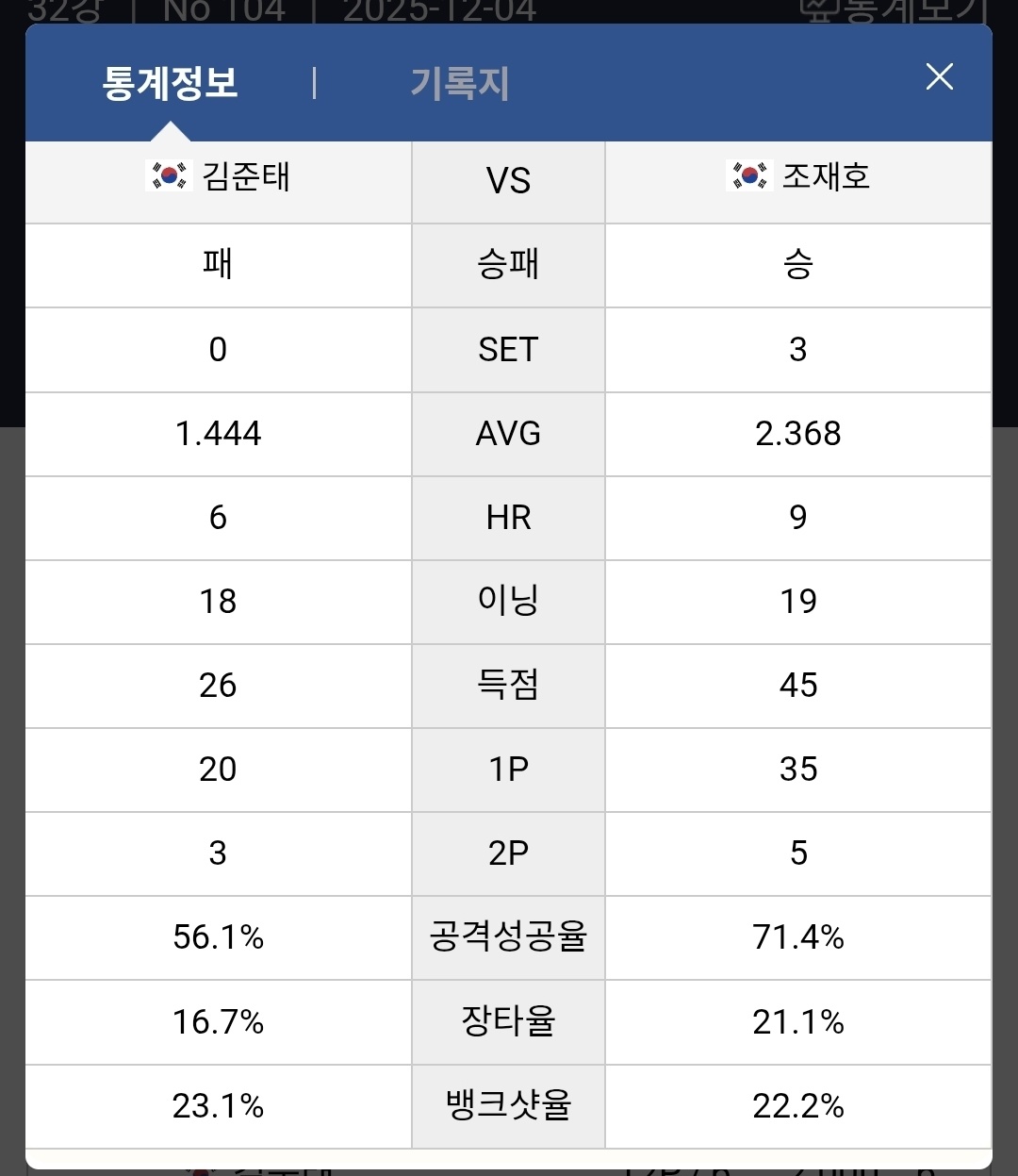 마지막 3세트에서도 경기 흐름은 크게 달라지지 않았습니다. 김준태는 5점에 그쳤고, 조재호는 다시 한 번 15점을 성공시키며 승리를 확정했습니다. 세트 평균 2.368, 하이런 9점이라는 기록은 조재호의 클래스를 증명하는 수치였습니다. 반면 김준태는 평균 1.444로 마무리하며 아쉽게 16강 진출에 실패했습니다. 경기 직후 공개된 공식 스탯에서도 조재호의 득점 45점, 공격 성공률 71.4%가 김준태의 26점, 56.1% 대비 크게 앞서 있었던 점이 승부의 핵심으로 분석됩니다.