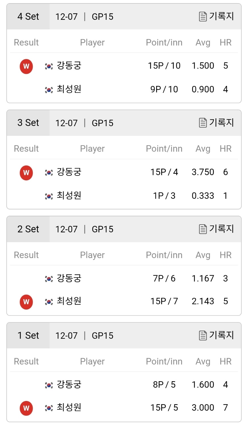 5세트에서는 강동궁이 다시 한 번 15점을 기록하며 역전에 성공했지만, 최성원이 6세트에서 반격에 성공하며 승부는 최종 7세트로 향했습니다. 마지막 7세트에서 강동궁은 평균 2.200에 해당하는 준수한 집중력을 유지하며 11점을 기록했고, 최성원의 추격을 완벽히 차단하며 최종 스코어 4대3으로 결승에 진출했습니다.