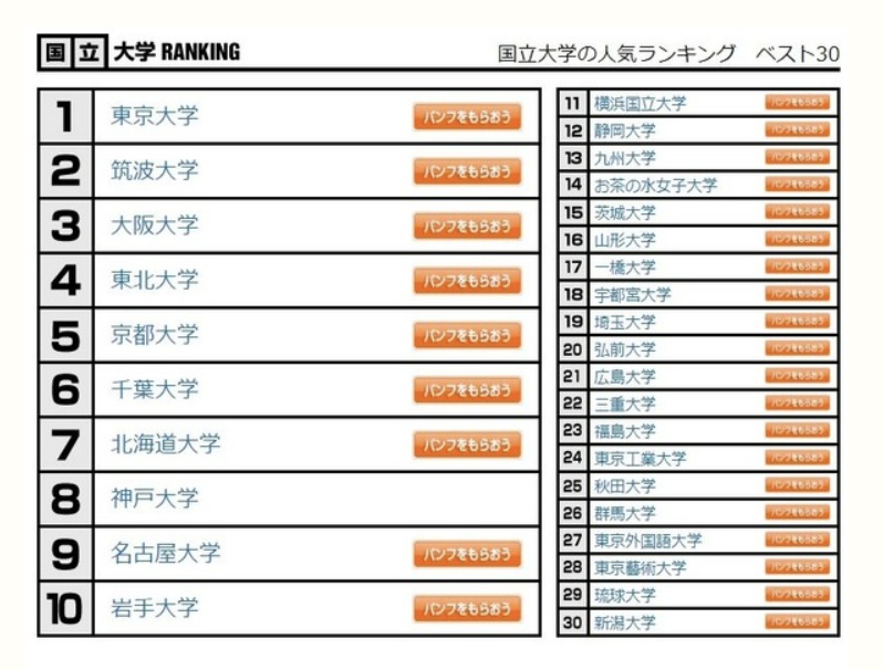 일본 국립대학 인기랭킹 베스트 30에 따르면, 순위 1위는 '도쿄대(東京大学)', 2위 '쓰쿠바 대학(筑波大学)', 3위 '오사카 대학(大阪大学)', 4위 '도호쿠 대학(東北大学)', 5위 '교토대학', 6위 '치바 대학', 7위 '홋카이도 대학', 8위 '고베대학', 9위 '나고야대학', 10위 '이와테 대학' 으로 나타났습니다.