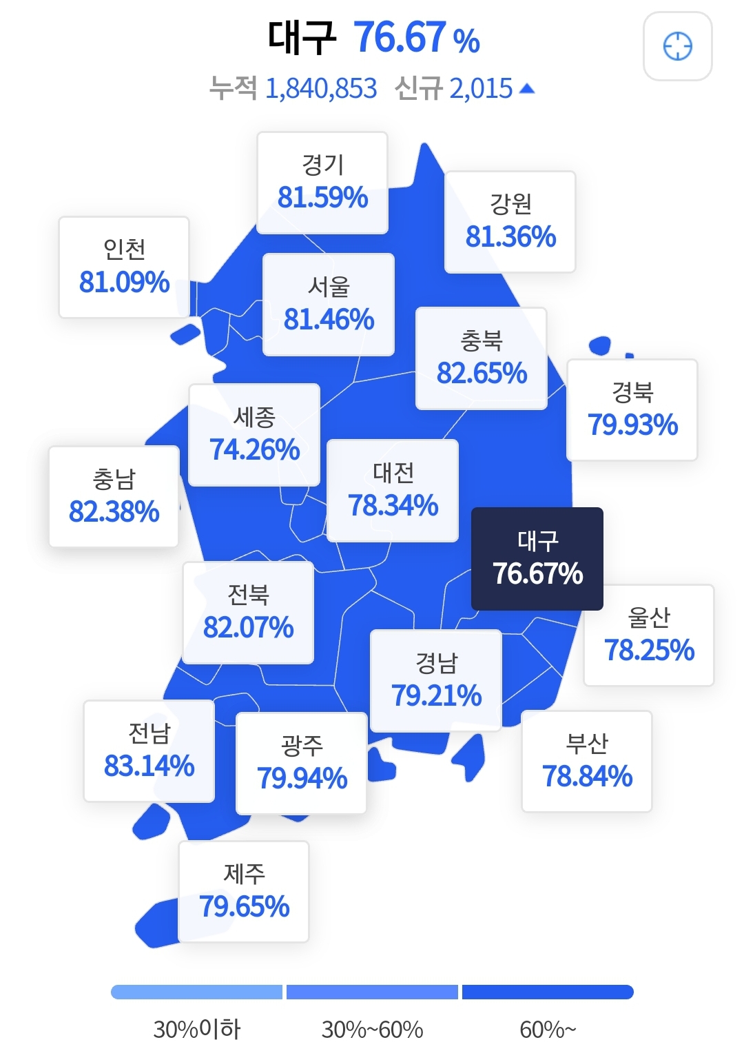 8일 0시기준 코로나 예방백신 접종률이 가장 낮은 지역은 세종시가 74.26%로 가장 낮으며, 대구가 76.67%로 두번째로 낮으며 부산,울산, 경남, 경북, 광주, 제주도 80%에 미치지 못하고 있습니다.