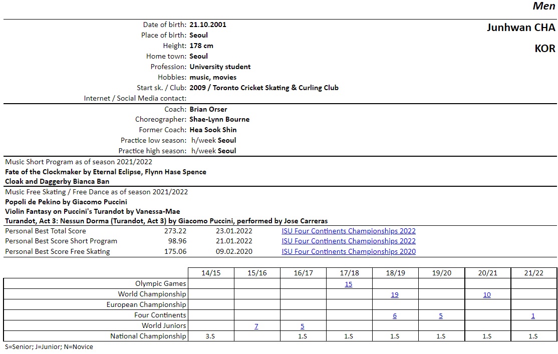 개인 최고 점수 쇼트 프로그램 98.96 : 21.01.2022 2022년 4대륙 선수권 대회