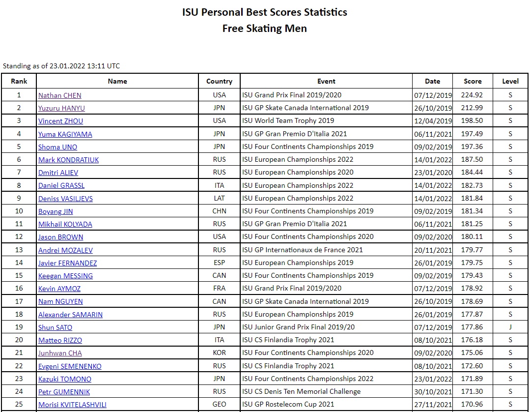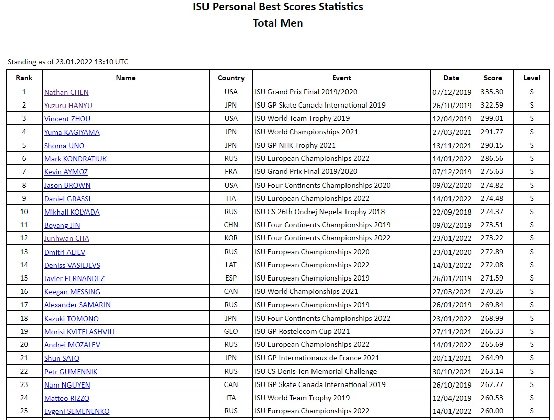 25위 에브게니 세메넨코 RUS ISU 유럽 선수권 대회 2022년 14/01/2022 260.00 S