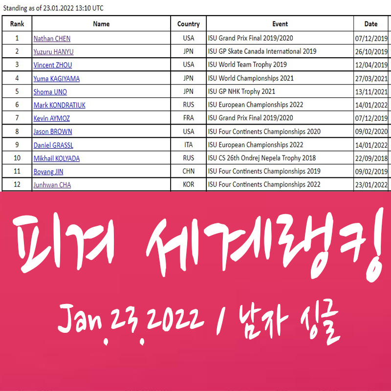 다음은 ISU 세계 빙상연맹이 홈페지를 통해서 공지한 세계 피켜스케이팅 남자 선수 랭킹입니다. ISU는 남자 피켜 스케이팅 부문에서 쇼트 프로그램(short program), 프리 스케이팅(free skating), 종합(tortal) 으로 다음과 같이 구분하여 게시하고 있으니 참고바랍니다.