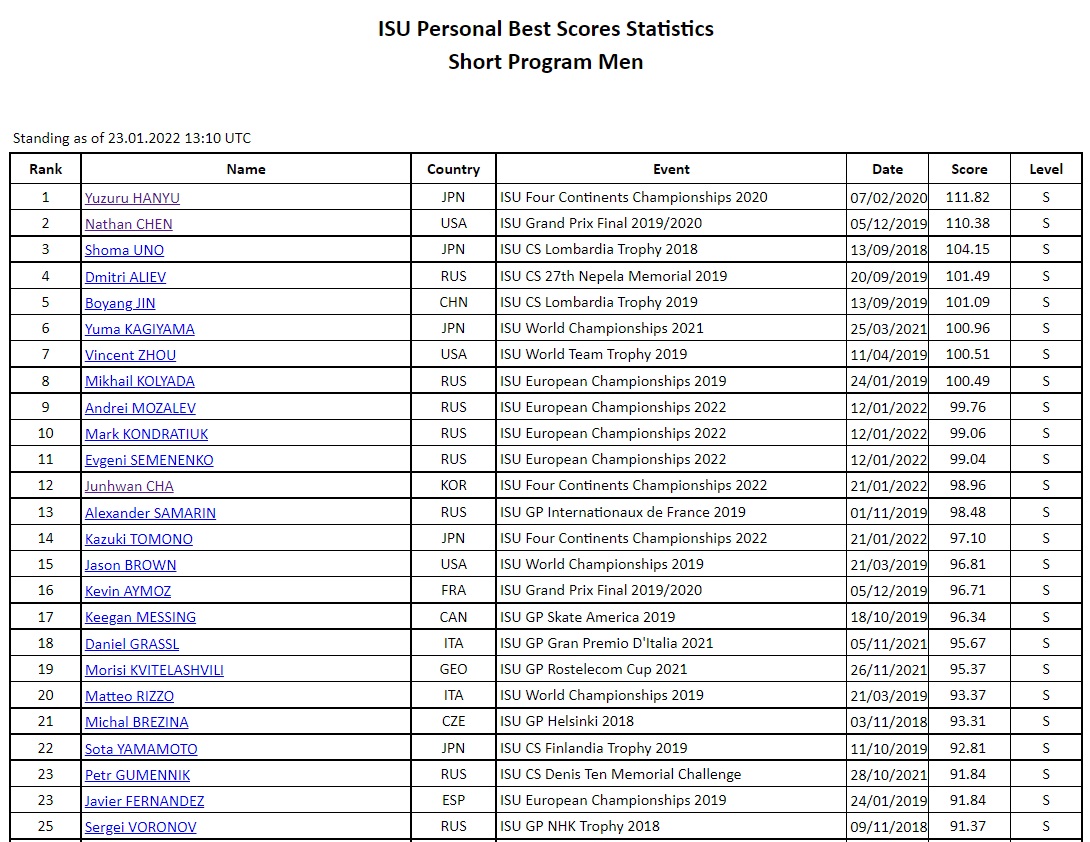 ISU 남자 피겨스케이팅 세계 랭킹 순위 - 쇼트 프로그램