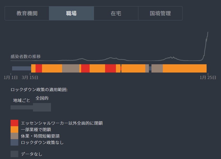 감염이 세계적으로 확산되는 가운데 이스라엘 정부는 학교 등 교육기관, 사무실, 국경 등을 폐쇄했습니다. 아래 차트는 직장에서의 봉새가 어느 시기에 실시되었는지를 보여주는 것 차트입니다. 적색은 필수인력 이외 전면적 봉쇄이며, 오렌지 색은 일부 업종 봉쇄, 금색은 휴업이나 시간 단축 요청, 회색은 봉쇄 정책이 없는 경우입니다. 차트를 보면 이스라엘의 직장 록다운(봉쇄)는 작년 중순까지 3차례이후 봉쇄이후 작년 하반기 부터는 전면적 봉쇄는 발령하지 않는 상태입니다.