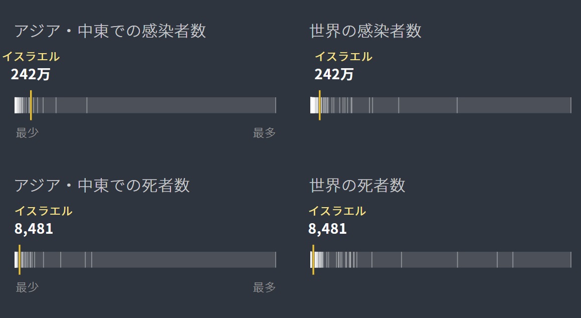 차트에 따르면 이스라엘의 감염자수는 240만명으로 세계 및 아시아 중동지역 감염자수와 비교하여 낮은 쪽에 위치해 있습니다만 코로나 예방 백신 접종비율 선도국가를 고려하면, 결코 좋은 성적은 아닌 것 같습니다. 한편 이스라엘의 코로나 감염으로 인한 사망자수 8,481명으로 감염자수 대비 적은 수치를 나타내고 있는 것으로 추정할 수 있습니다.