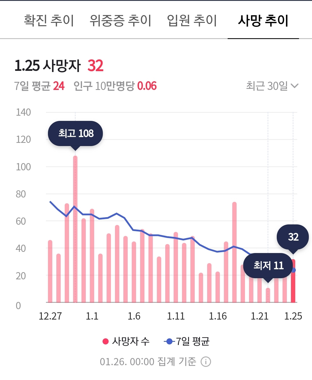 다행히 어제 하루 코로나 감염 사망자수는 32명(7일평균 24명, 인규 10만명당 0.11명)으로 지난해 12월20일 하루 사망자수 108명을 정점으로 감소 추세를 나타내고 있습니다.