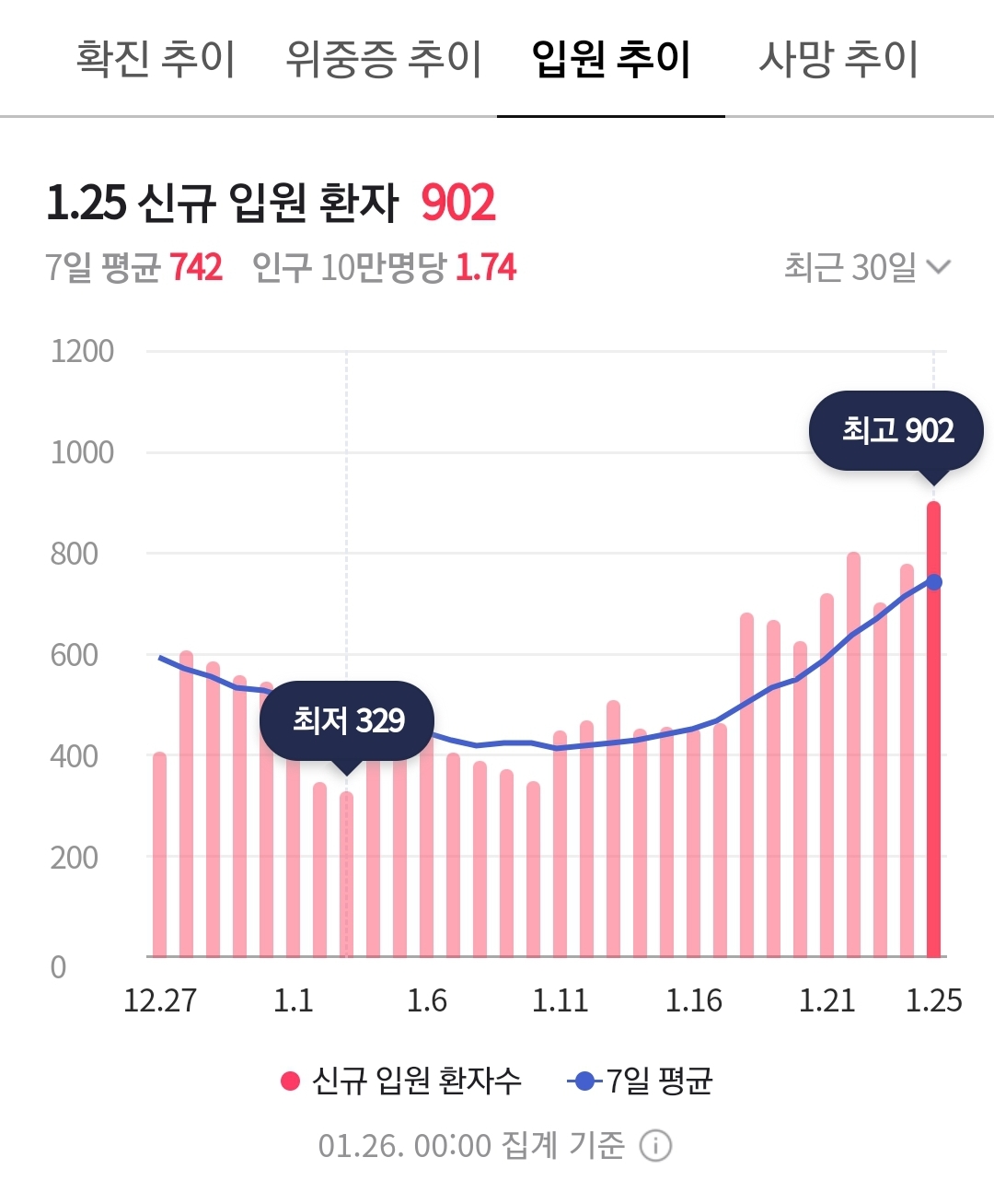 한편 1월 25일 코로나 감염으로 인한 신규 입원 환자수는 902명(10만명당 1.74명, 7일 평균 입원환자수 742명)으로 지난 1월 3일 최저치인 329명 대비 3배 가량 늘어 났습니다.