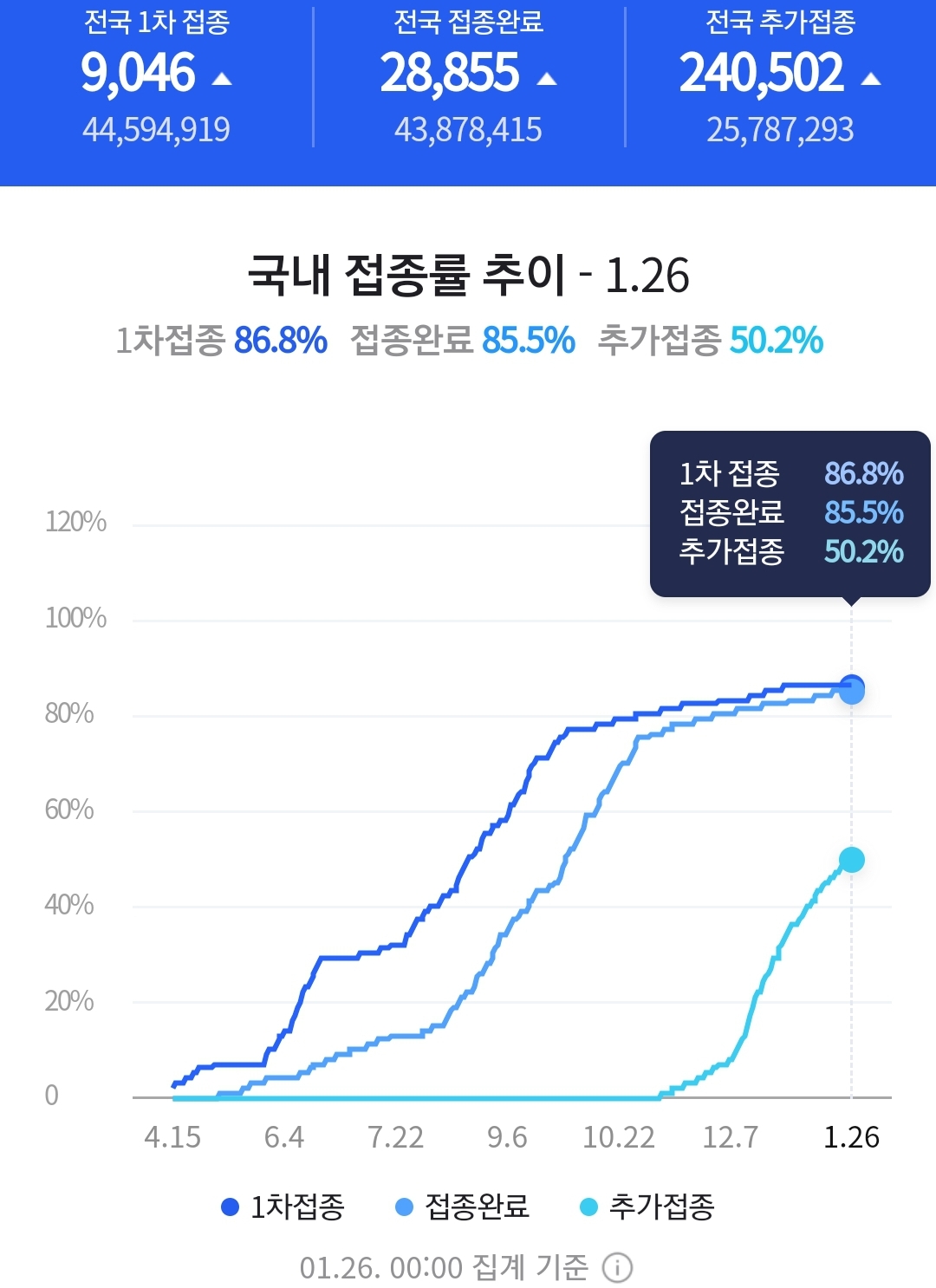 1월26일 0시기준 코로나 예방 백신 1차 접종률은 86.8%, 완전 접종률은 85.5%로 접종룰 추이는 85%대에서 더 이상 늘어나지 않고 포화 상태를 보이고 있으며, 추가 접종률은 50.2%를 보이고 있습니다.