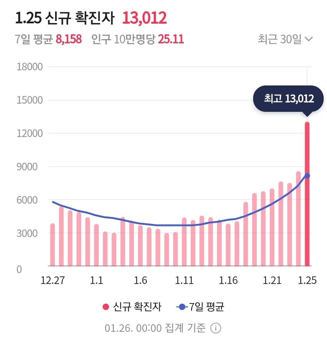 1월26 00시 기준 국내 코로나 신종 바이러스 확진자수가 사상 최대로 13,012명으로 코로나 팬데믹이후 사상 처음으로 신규 확진자수 1만 3천명 돌파 했다고 정부가 발표했습니다.