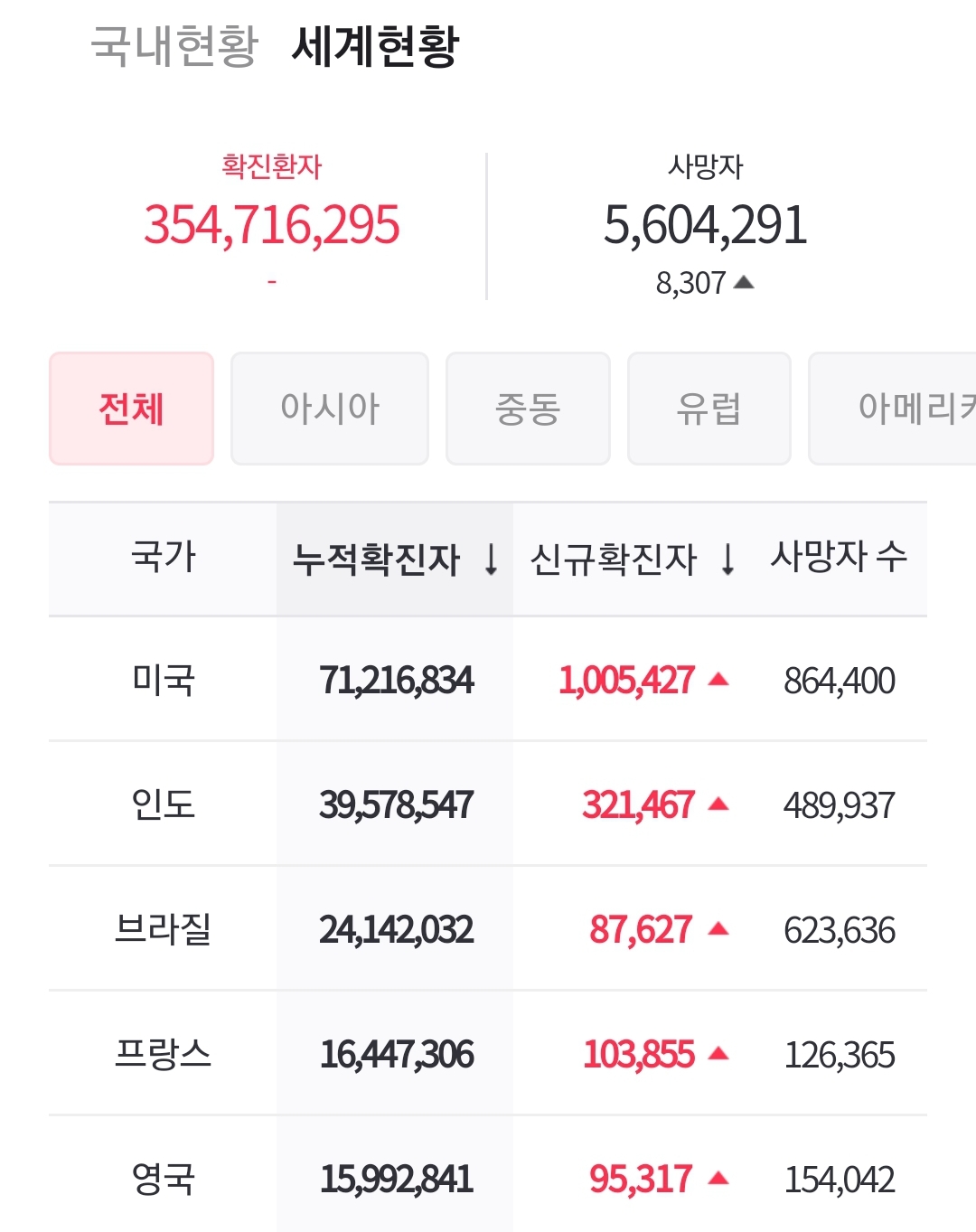 또한 전세계 코로나 누적 확진자수는 3억5천만명을 넘었으며, 전세계 코로나 사망자수는 560만명에 이르고 있습니다. 이가운데 전세계 코로나 누적 감염자수와 사망자수 1위는 미국으로 각각 7,112만명, 86만명을 나타내고 있습니다. 인도, 브라질, 프랑스, 영국이 바로 미국에 이어 2위부터 5위까지를 점유하고 있습니다.