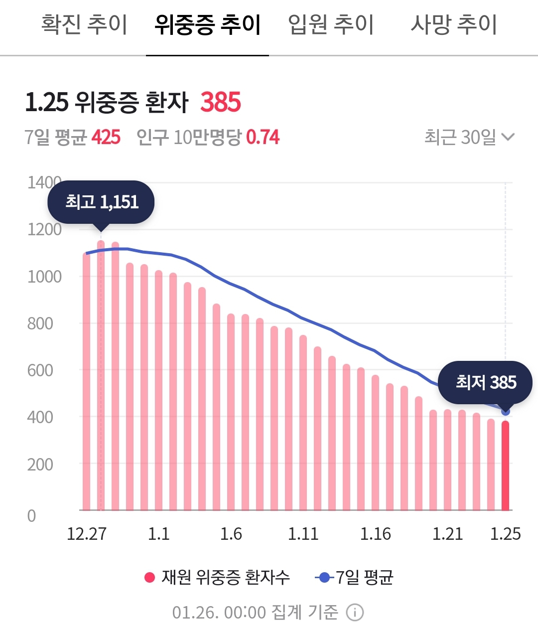 어제 하루 코로나 위중증 환자수(10만명당 0.74명, 7일 평균 425명)는 385명으로 지난해 12월 28일 1,151명을 정점으로 점진적 감소 추세를 나타내고 있습니다.