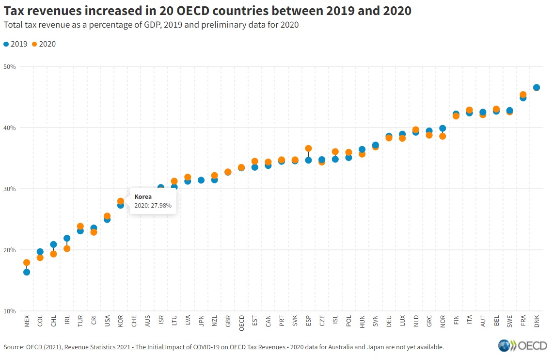 OECD 세입 통계 2021년판 (Revenue Statistics 2021)에 따르면 OECD 평균 세수의 GDP 대비 비율은 2020년 33.5%로 2019년부터 0.1%포인트로 근소하게 상승했습니다. 대부분의 OECD 여러 나라에서는 명목 세수입이 감소했습니다만, 각국의 GDP의 감소가 큰 경우가 많았기 때문에 평균 세수입의 GDP 대비가 약간 상승했습니다.