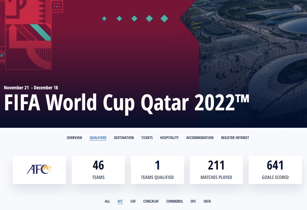 AFC 아시아 지역에 할당된 2022년 카타르 월드컵 진출권(진출 티켓)은 5장 내지 6장입니다. 확실한 것은 1조와 B조 두 조가 경기를 펼쳐 상위 두 팀이 2022년 카타르 월드컵 본선에 진출하게 되며, 각 조의 3위 팀은 월드컵 진출권을 놓고 단판 승부를 벌이게 됩니다.