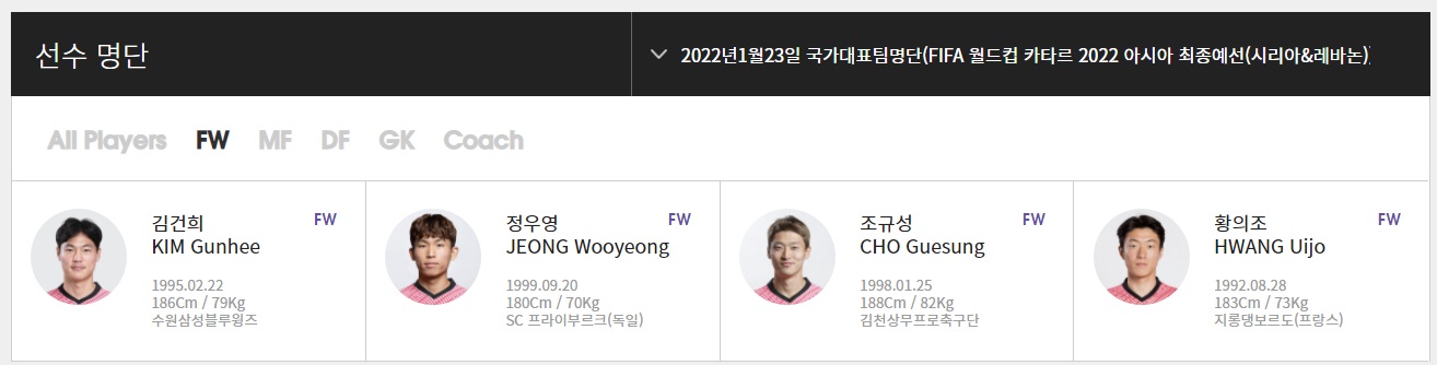 또한 시리아 내부 상황으로 시리아 현지가 아닌 중립지역인 두바이에서 경기를 펼치는 것도 승리에 대한 기대감을 높이고 있습니다. 오늘 오전 매스컴 보도에 따르면 중앙 수비수 정우영 선수도 그간의 경기에서 경고누적으로 오늘 경기에 뛸 수 없는 상황이며, 에이스 손흥민과 공격수 황희찬도 빠진 상태이지만 바로 직전 대회인 레바논전에서 황의조의 절묘한 어시스트를 받아 결승골을 터트린 조규성 선수가 있습니다.