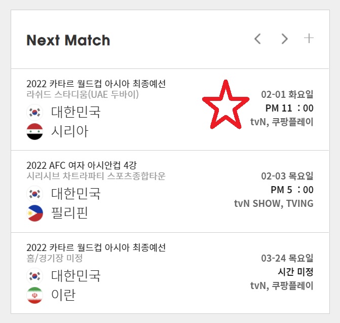 2. 2022 남자축구 카타르 월드컵 아시아 최종예선전 (한국-이란전) : 3월 24일 목요일 (시간은 미정)