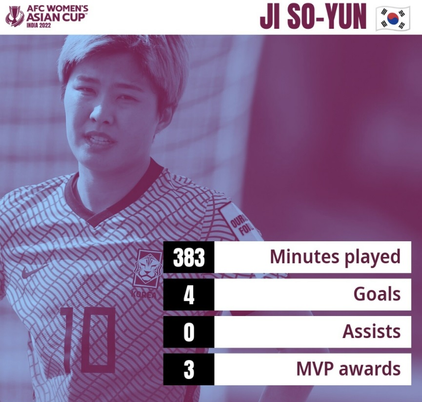 "아시아 축구 연맹(AFC) 여자 축구 아시안컵 우승에 총력을 기울일 것입니다. 트로피를 들어 올리는 것은 저와 팀원들에게 큰 의미가 있습니다. 최고 득점자 상을 받는 것은 보너스가 될 것이지만, 현재 제 유일한 목표는 골을 넣는 것입니다." 2006년에 3위를 차지한 한국은 AFC 여자 아시안컵에 12번 연속 출전하여 최고의 성적을 거둔 아시아 국가 가운데 컨티넨탈 타이틀을 차지한 적이 없는 가장 상위의 국가입니다.