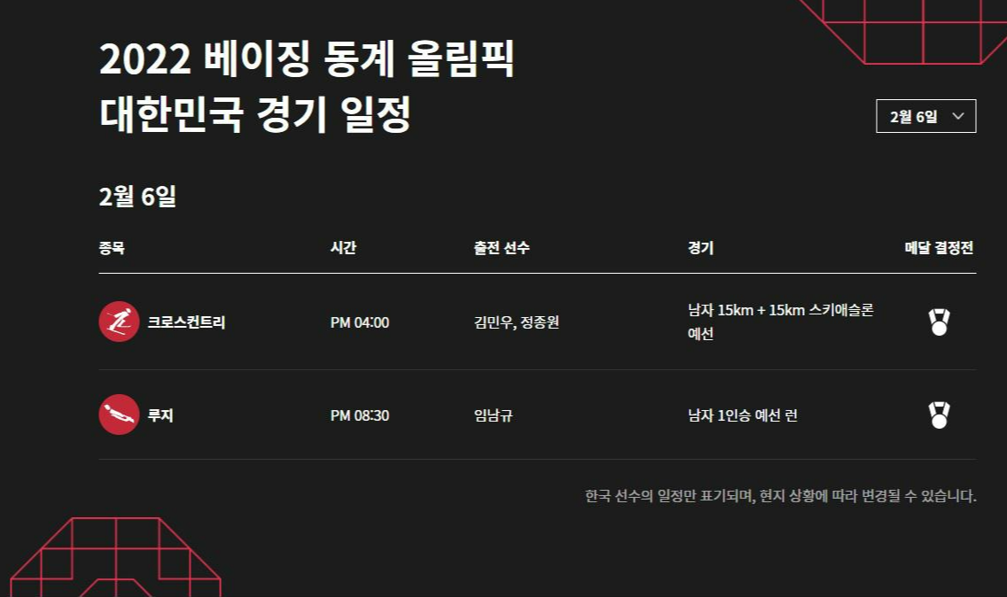 오늘 2월6일 베이징 동계 올림픽 한국 경기 출전 종목은 두 종목으로 크로스컨트리 스키와 루지 1인승 경기입니다. 제1경기는 오후 4시 크로스컨트리 남자 예선 종목(15km + 15km 스키애슬론)으로 한국 크로스 컨트리 국대 김민우 선수와 정종원 선수가 출전을 합니다. 6일 제2 경기는 오후 8시30분에 열리는 루지 종목으로 어제 런1, 런2에서 두차례 루지 슬로프를 달렸던 루지 국가대표 임남규 선수가 런3과 런4(밤 10시 15분)를 펼칩니다.