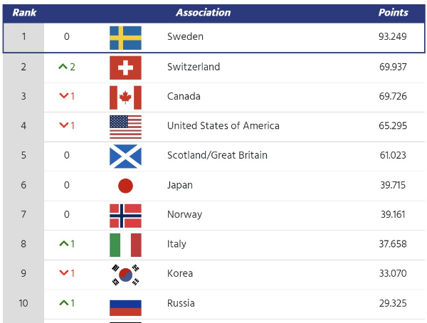 세계 남자 컬링 랭킹 순위 1위는 스웨덴 93.249입니다. 2위 스위스 69.937입니다. 3위 캐나다 69.726입니다. 4위 미국 65.295입니다. 5위 스코틀랜드/영국 61.023입니다. 6위 일본 39.715입니다. 7위 노르웨이 39.161입니다. 8위 이탈리아 37.658입니다. 9위 한국 33.070입니다. 10위 러시아 29.325입니다.