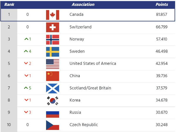 4위는 러시아 60.549입니다. 세계 컬링 랭킹 순위 5위는 캐나다 59.124입니다. 6위는 미국 52.848입니다. 7위는 일본 47.099입니다. 8위는 스코틀랜드/영국이 공동으로 46.677입니다.