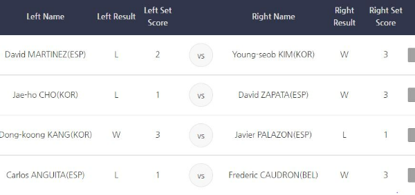 전날 12일 16강에서 '벨기에 절친' 에디 레펜스를 상대로 세트스코어 3-1로 승리하던 컨디션은 아니었습니다. 다소 긴장한 모습의 쿠드롱 선수는> 2세트까지 힘든 경기였지만 3세트부터는 계속되는 하이런 득점으로 경기를 손쉽게 풀어나가 3, 4세트를 연이어 따내며 세트스코어 3-1로 승리했습니다.