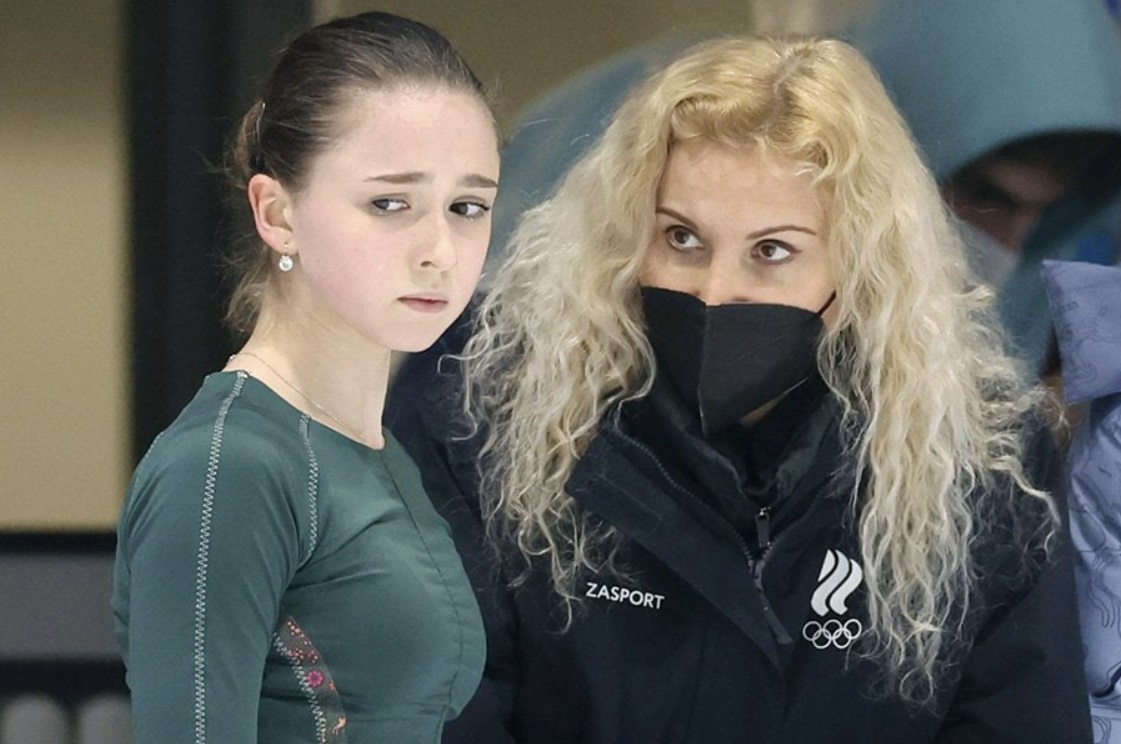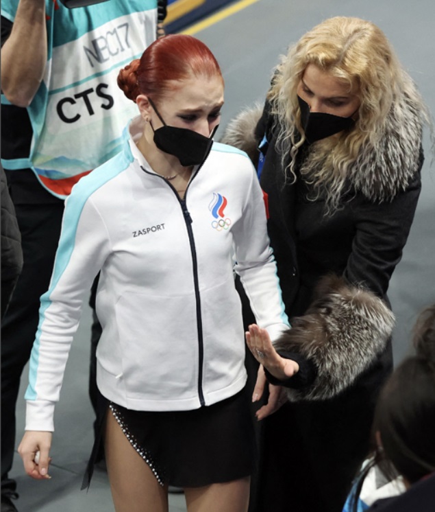 여자 피겨 메달 제조기라고 불린 피겨계 철의 여인 에테리 투트베리제 코치가 울면서 어깨를 축 늘어뜨리는 발리예바를 위로하는 기색도 없이 "왜 싸우지 않았나요? 설명해 주세요!"라고 다그쳤습니다.