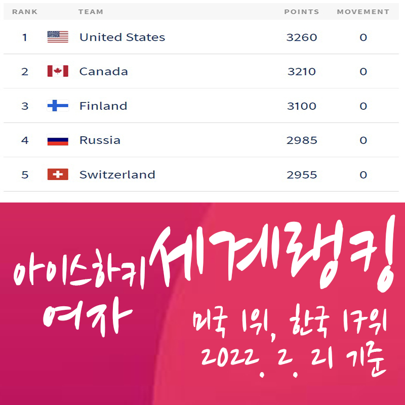 여자 아이스하키 세계 랭킹 순위 (1위는 미국, 한국은 17위)