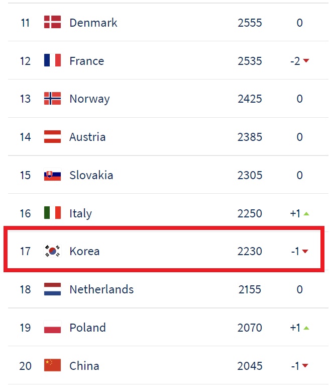 여자 아이스하키 세계 랭킹 순위 10위권 밖에는 11위 덴마크, 12위 프랑스, 13위 노르웨이가 뒤따르고 있으며, 우리나라 한국 여자 아이스하키 대표팀의 세계 랭킹 순위는 17위 랭킹포인트 2230점을 마크하고 있습니다. 이어서 빙상 강호 네덜란드가 18위, 폴란드가 19위, 중국이 20위에 올라 있습니다.