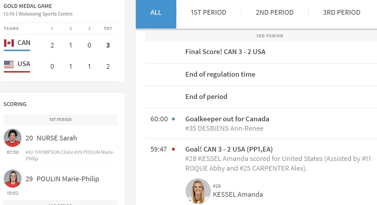 여자 아이스하키 금메달 결정전, 미국-필린드 결승전에서는 미국의 켄달 코인 스코필드와 핀란드의 엘리사 홀로파이넨이 맞대결을 펼쳤습니다. 여자 아이스 하키 대표팀 10개 팀이 참가한 가운데 모두 다른 성취감과 목적을 가지고 각자의 나라로 귀국하였습니다. 이제 남은 것은 사상 처음으로 올림픽 해에 최고 수준의 IIHF 여자 세계 선수권 대회가 열리는 8월로 이목이 쏠리고 있습니다. 한국 여자 아이스하키 대표팀도 이본 올림픽에서 볼 수는 없었지만 앞으로 4년동안 각 대룩별 대회, 월드컵 대회에서 좋은 성적으로 훗날을 기약해 주시기 바라니다.