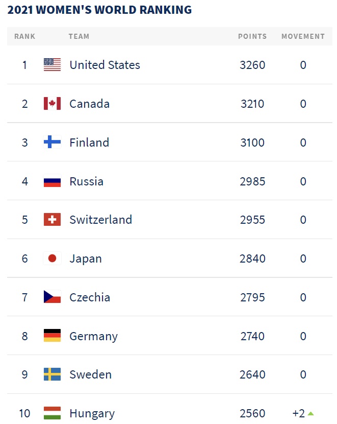 먼저 여자 아이스하키 세계 랭킹 순위 입니다. 아이스하키 여자 세계랭킹 1위는 미국으로 랭킹 포인트 3260입니다. 아시스하키 여자 세계 랭킹 2위는 캐나다로 랭킹 포인트 3210입니다. 아이스하키 여자 세계랭킹 3위는 핀란드 3100점입니다. 4위는 러시아로 2985점입니다. 아이스하키 여자 세계랭킹 순위 5위는 스위스로 2955 점입니다. 이어서 아이스하키 여자 세계랭킹 순위 6위는 일본으로 2840, 7위는 체코로 2795이며, 8위는 독일로 랭킹포인트 2740점을 기록하고 있습니다. 아이스하키 여자 랭킹 세계 9위는 스웨덴으로 2640, 10위는 헝가리로 2560점입니다.