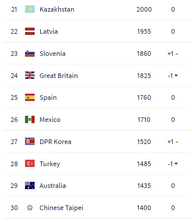 | 30 | Chinese Taipei | 1400 | 0 | |