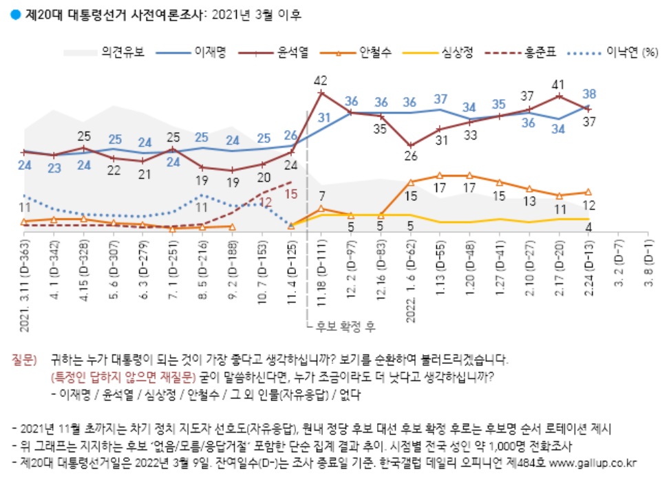 한국갤럽이 22∼24일 성인 1,000명을 대상으로 설문한 결과에 따르면 대선후보 지지도 조사에서 이재명 후보는 38%, 윤석열 후보는 37%의 지지를 얻었습니다. 안철수 후보는 12%, 심상정 정의당 후보는 4%였습니다.다. 의견을 유보한 응답은 7%였습니다. 지난주 동일 조사와 비교하면 이재명 후보는 4%포인트 올랐고, 윤석열 후보는 4%포인트 내렸습니다. 전주 윤 후보가 오차범위 밖에서 이 후보를 앞섰지만 두 사람의 격차는 다시 오차범위 내로 줄어들었습니다.