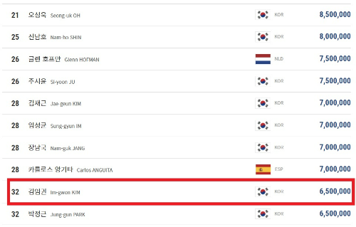 프로당구 김임권 선수의 PBA 투어 경기 상금 랭킹