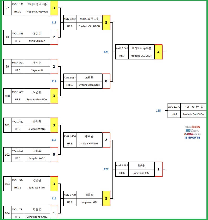 그러나 드디어 내놓라는 선수들을 무서운 실력으로 꺽으며 올시즌(2021-2022) 마지막 PBA투어인 웰컴저축은행 웰뱅 PBA 챔피언십 결승전까지 올라왔습니다. 4강 대진표에는 김종원 최원준 쿠드롱 선수와 함께 올라 왔으나 4일 오후에 먼저 펼쳐진 준결승(PBA투어 공동 3위 확보로 상금 1천만원)에서 김종원선수는 쿠드롱 선수에게 패하고 말았습니다.