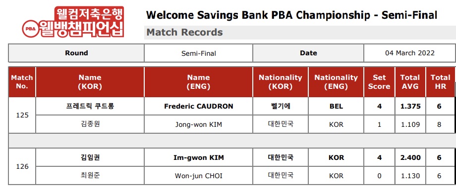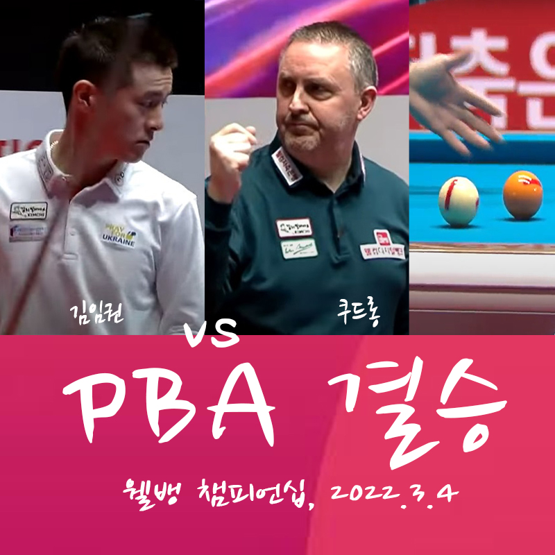 | 웰컴저축은행 웰뱅 PBA 챔피언십 결승전 경기결과 - 우승자 쿠드롱 PBA투어 5회 우승, 3개 대회 연속우승 (준우승자는 김임권 당구선수) (0) | 2022.03.05 |