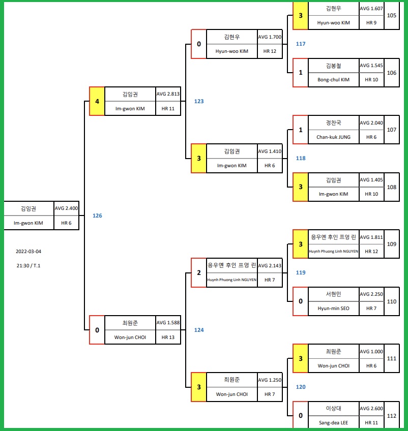 결국은 김임권 선수가 승리하려면 초반에 쿠드롱을 당황하게만드는 강한 득점력이 살아 나야합니다. 결승전까지 올라 오면서 보여준 실력이라면 충분히 가능하리라 생각합니다. 쿠드롱을 맞아서도 평소처럼 이번대에서 보여준 3쿠션 실력을 유감없이 발휘해주기 바랍니다.