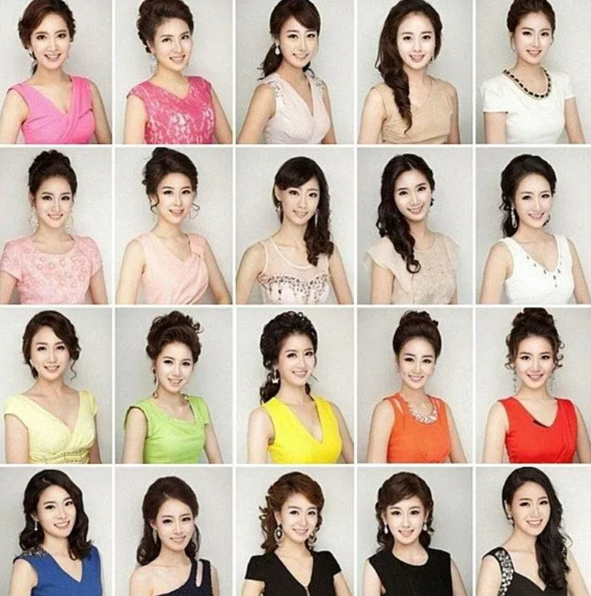 이것은, 한류 탤런트나 가수를 보면 잘 알 수 있습니다. 분명 미남미녀가 많은데 다 똑같이 생겼어요. 미스콘(미인대회) 1위 역대 우승자가 모두 똑같이 생겼다는 트위터를 보고 감탄한 적이 있어요. 다만 얼굴을 모두 극적으로 바꾸는 수술이 아니라, 눈꺼풀 성형이나 눈꺼풀을 끌어 올리거나 지방을 빼는 성형술이 거의 절반을 차지한다고 합니다. 그리고 20대 여성의 60% 이상이 성형을 한 적이 있다고 대답했다고 합니다.