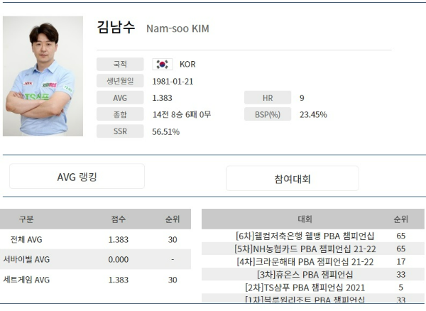 올시즌 2021-22 2차투어 TS샴푸 PBA 챔피언십 대회, 김남수 선수 통계를 보면, 총 다섯번의 세트경기에서 173이닝동안 애버리지 1.358을 기록하였습니다. 한 큐에 연타를 치는 하이런 장타는 8점을 기록하였습니다.