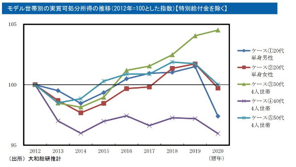 - 2012년~2020년의 임금통계 등을 기초로 5개의 모델세대를 설정해, 제2차 이후의 아베정권하의 가계의 실질 가처분 소득 추이를 추계했습니다.
