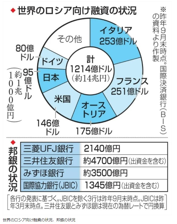 특히 일본 은행은 러시아 국내의 기업이나 사업에 대해서 합계 1조엔초과의 융자를 안고 있는 것이 14일, 밝혀졌습니다. 경제 제재 강화로 러시아 경제가 타격을 받는 가운데, 상환이 지연되면 수익의 감소 요인이 됩니다 .융자 전체에서 차지하는 러시아용의 비율은 적지만, 우크라이나 정세에 개선의 조짐은 보이지 않고, 자금의 회수에 먹구름이 감돌기 시작했습니다.